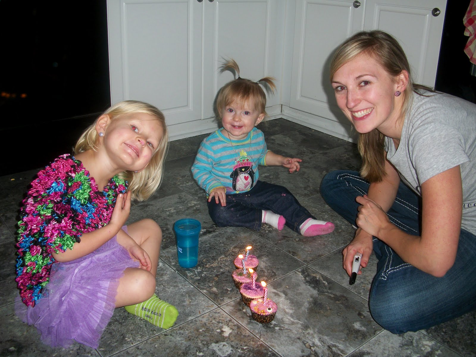 Then on Wednesday... Gracie wanted to make me cupcakes. So she made them Pink Lemonade Cupcakes (interesting) by adding koolaid to the cake and then lemon frosting. Gracie decorated them too. Katie learned how to blow and that was probably the best memory during my birthday. She was stinkin' cute. That is why there is so many pictures. Now Katie says "Haaaawwwt" in addition to dad and yeah all the time. Love it.
